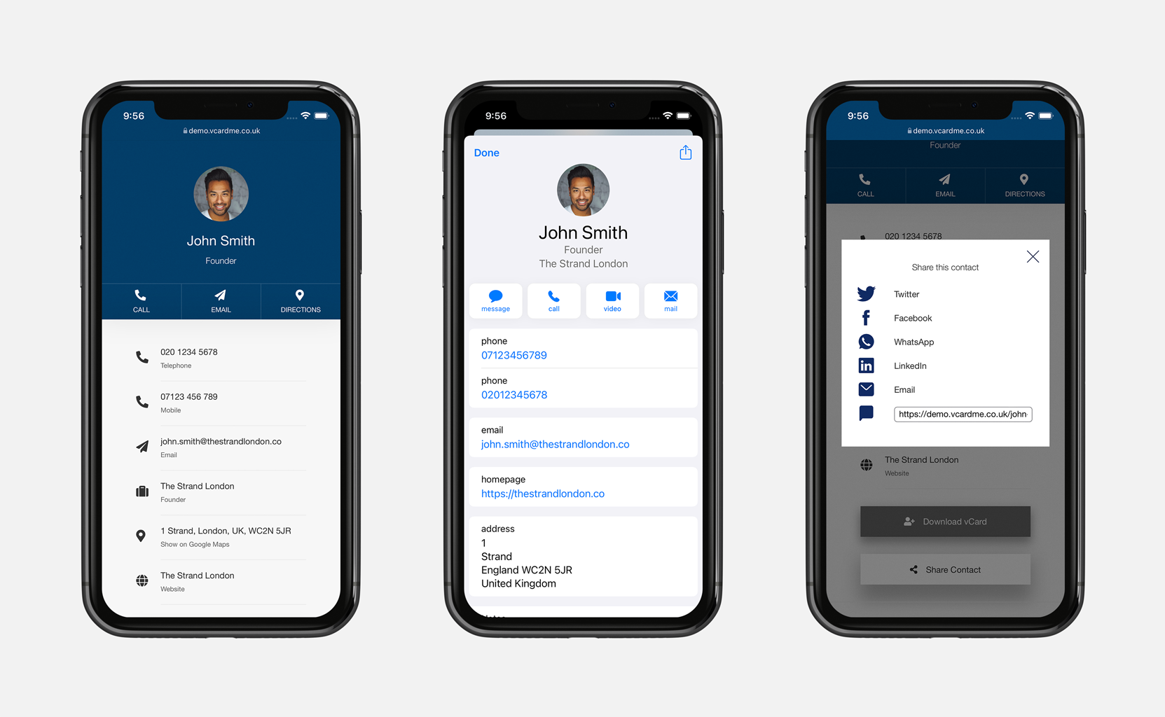 Whereas other platforms want you to share your details via their links and with their branding, vCard Me is different as we enable you to use your own URL and branding for your profiles.This includes custom links (such as share.yourcompany.com) and custom visuals (such as your organisation's logo and colours).You can also choose exactly what happens when your profile is shared. For example, your profile can automatically offer to add your contact details to the recipient's device right away, without any further interaction needed!